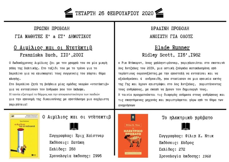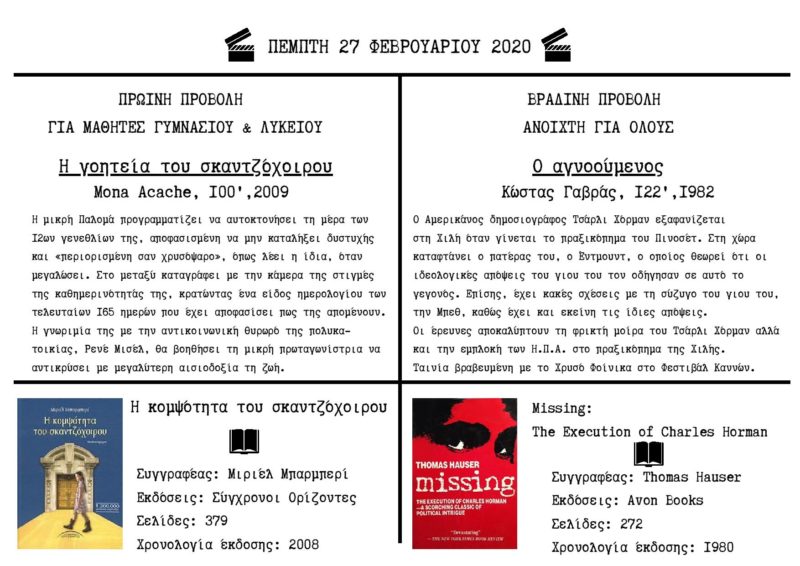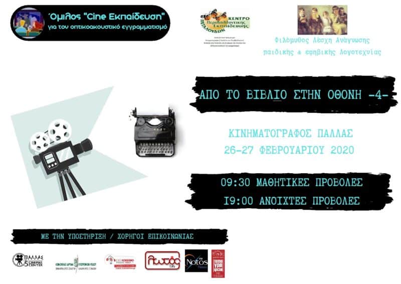Ο Όμιλος Cine-Εκπαίδευση για τον οπτικοακουστικό εγγραμματισμό σας προσκαλεί στις κινηματογραφικές προβολές με θέμα: “ΑΠΟ ΤΟ ΒΙΒΛΙΟ ΣΤΗΝ ΟΘΟΝΗ” που θα γίνουν στον Κινηματογράφο ΠΑΛΛΑΣ την Τετάρτη 26 Φεβρουαρίου 2020 και την Πέμπτη 27 Φεβρουαρίου 2020.