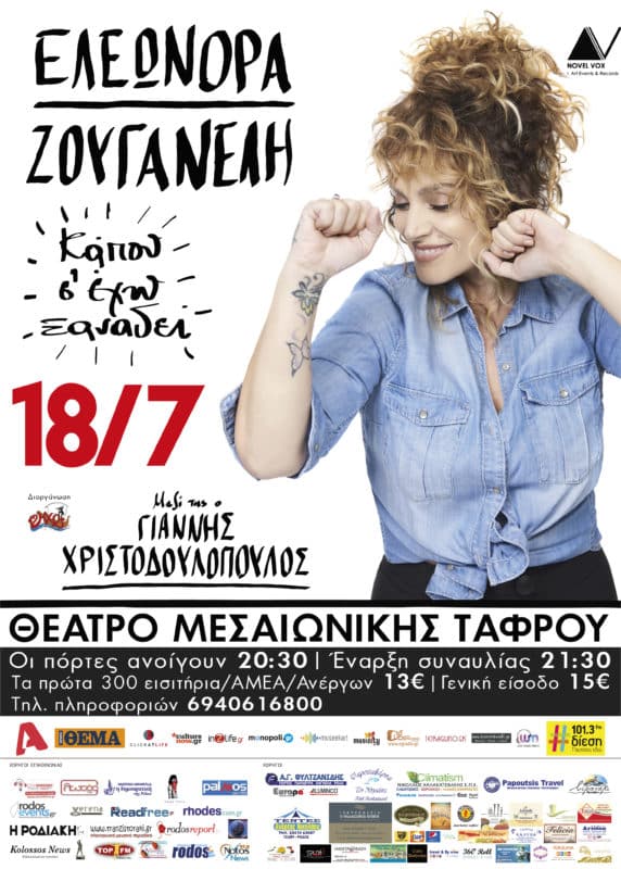 Η Ελεωνόρα Ζουγανέλη, έπειτα από ένα δυνατό χειμώνα συνεχών παρατάσεων σε Αθήνα και Θεσσαλονίκη, έρχεται αυτό το καλοκαίρι στη Ρόδο στο Θέατρο Μεσαιωνικής Τάφρου «Μελίνα Μερκούρη» την Πέμπτη 18 Ιουλίου φωνάζοντας το σύνθημα, «κάπου σε έχω ξαναδεί».