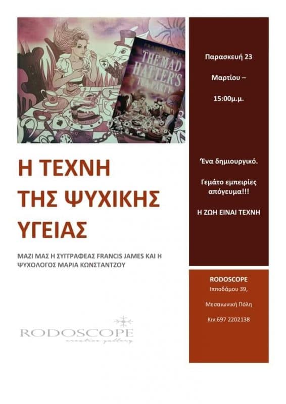 Ας μιλήσουμε για την «Τέχνη της Ψυχικής Υγείας». Η συγγραφέας Francis James με το βιβλίο της “The Mad Hatter’s Tea Party” μας καλεί σε μια διαφωτιστική κουβέντα την Παρασκευή 23 Μαρτίου 2018, ώρα 15.00, στον φιλόξενο χώρο του Rodoscope, όπου μαζί με την ψυχολόγο Μαρία Κωνστάντζου θα προσεγγίσουν δημιουργικά τη σημασία και σπουδαιότητα της ψυχικής υγείας στη ζωή μας.
