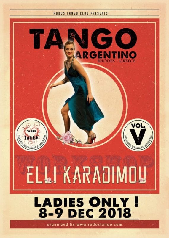 Η Elli Karadimou με πλούσια καλλιτεχνική δράση, θα μοιραστεί μαζί μας γνώσεις & μυστικά του αργεντίνικου τάνγκο μέσα από την πολυετή εμπειρίας της ως χορεύτρια, χορογράφος και χοροδιδάσκαλος, ως πρωταθλήτρια Ευρώπης στο σκηνικό τάνγκο το 2011 και ως φιναλίστ στο Campeonato Mundial de Tango 2010 στο Buenos Aires.