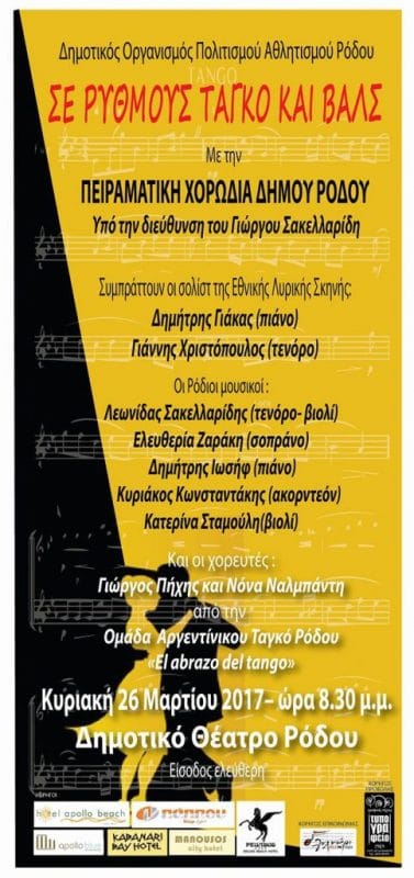 Μια βραδιά retro με αγαπημένα ταγκό, βαλς, πόλκες και ταραντέλες από το ελληνικό και διεθνές ρεπερτόριο μας χαρίζει η Πειραματική Χορωδία Δήμου Ρόδου υπό τη διεύθυνση του Γιώργου Σακελλαρίδη την Κυριακή 26 Μαρτίου 2017 στο Δημοτικό Θέατρο Ρόδου. Μουσική, τραγούδια και χορός επί σκηνής σ’ ένα νοσταλγικό ταξίδι γεμάτο μελωδίες.