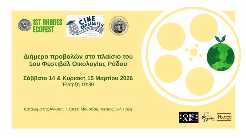 Διήμερο προβολών από τον Όμιλο CINE ΕΚΠΑΙΔΕΥΣΗ στο πλαίσιο του 1ου Φεστιβάλ Οικολογίας Ρόδου 14-15 Μαρτίου 2026, Κατάλυμα της Αγγλίας Ο Όμιλος CINE ΕΚΠΑΙΔΕΥΣΗ σας προσκαλεί στο διήμερο προβολών που διοργανώνει σε συνεργασία με τον Σύλλογο Αρχιτεκτονικής και Πολιτιστικής Κληρονομιάς…