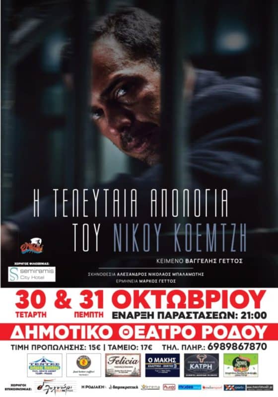 «Η Τελευταία Απολογία του Νίκου Κοεμτζή» του Βαγγέλη Γέττου στο Δημοτικό Θέατρο Ρόδου