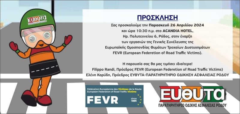 Κλείνοντας 20 χρόνια 2004-2024 δράσεων, η Ε.Υ.ΘΥ.Τ.Α-ΠΑΡΑΤΗΡΗΤΗΡΙΟ ΟΔΙΚΗΣ ΑΣΦΑΛΕΙΑΣ ΡΟΔΟΥ (EFTHITA-OBSERVATORY ROAD SAFETY RHORES), μέλος της F.E.V.R. (Ευρωπαϊκή Ομοσπονδία Θυμάτων Τροχαίων) ανέλαβε την διεξαγωγή της Γενικής Συνέλευσης της F.E.V.R. (Ευρωπαϊκή Ομοσπονδία Θυμάτων Τροχαίων) στη Ρόδο με την συμμετοχή εκπροσώπων της από Αγγλία, Γαλλία, Γερμανία, Ιταλία, Ελλάδα, Ιρλανδία Ισπανία, Πορτογαλία, Κροατία και Πολωνία στις 26-28 Απριλίου 2024.