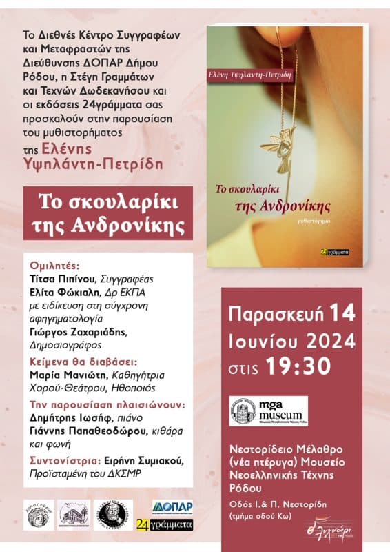Το Διεθνές Κέντρο Συγγραφέων και Μεταφραστών της Διεύθυνσης ΔΟΠΑΡ του Δήμου Ρόδου σε συνεργασία με τη Στέγη Γραμμάτων και Τεχνών Δωδεκανήσου και τις εκδόσεις 24γράμματα πραγματοποιούν την παρουσίαση του μυθιστορήματος της Ελένης Υψηλάντη-Πετρίδη, με τίτλο «Το σκουλαρίκι της Ανδρονίκης», την Παρασκευή 14 Ιουνίου 2024 και ώρα 19:30 στην αίθουσα της Νέας Πτέρυγας του Νεστοριδείου Μελάθρου (οδός Ι. & Π. Νεστορίδη – τμήμα οδού Κω).