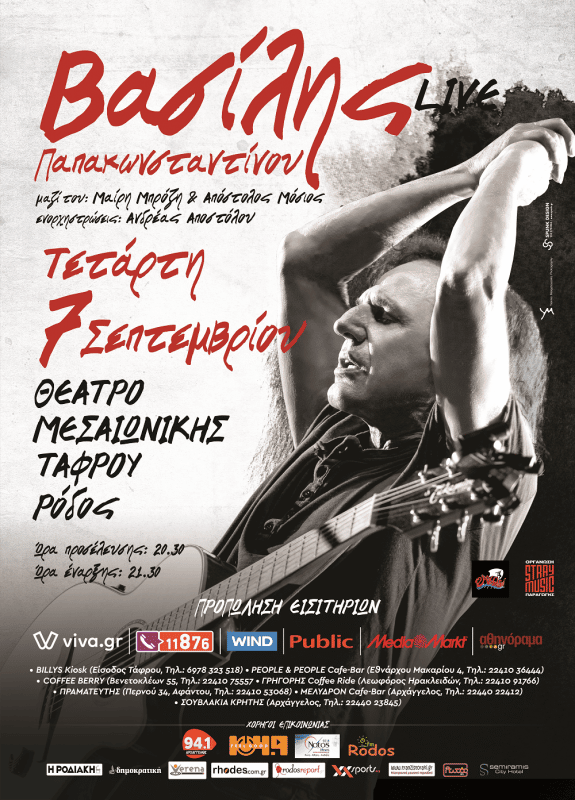 Την Τετάρτη 7 Σεπτεμβρίου ο Βασίλης Παπακωνσταντίνου θα μας χαρίσει μια μοναδική συναυλία στο Θέατρο Μεσαιωνικής Τάφρου στη Ρόδο.